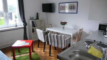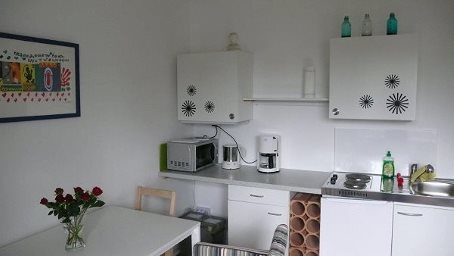 Die neue Ferienwohnung „Kajüte“ ist im Sommer 2013 in die Vermietung gegangen. Sie ist mit ca. 35qm etwas kleiner als die andere Ferienwohnung, aber auch für 4 Personen geeignet. Auch Sie hat neben dem Schlafzimmer einen Wohnraum der mit einer Küchenzeile mit Microwelle, Kaffemaschine, Wasserkocher, zwei Kochzonen und einem Kühlschrank mit kleinem Gefrierfach ausgestattet ist. Ein Flachbildfernseher ist vorhanden. Das Sofa kann zu einem 1,60m breiten Bett ausgeklappt werden.